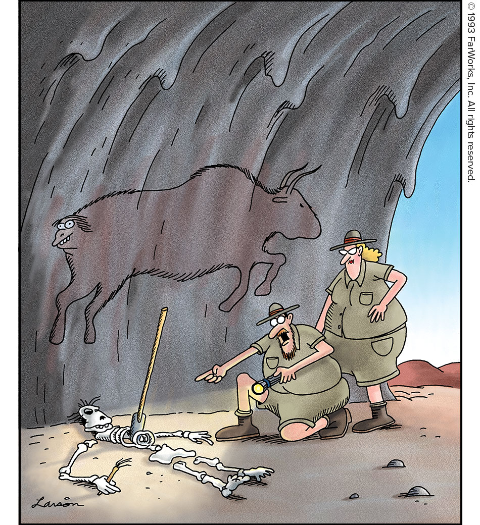 “Amazing! The mummified remains of a prehistoric cave-painter, still clutching his brush! … Seems he made an enemy, though.”