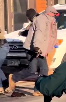 You are right that in the first picture alone, you cannot clearly see what is on the waist that the guy in the gray jacket tries to grab/hold. However the screenshots are meant to show moments from the video, and in the video it is more clear that the gray jacket guy tries to take out the gun, which is also shown by him being the one who walks away with the victim’s gun at the end (can be seen from other angles)