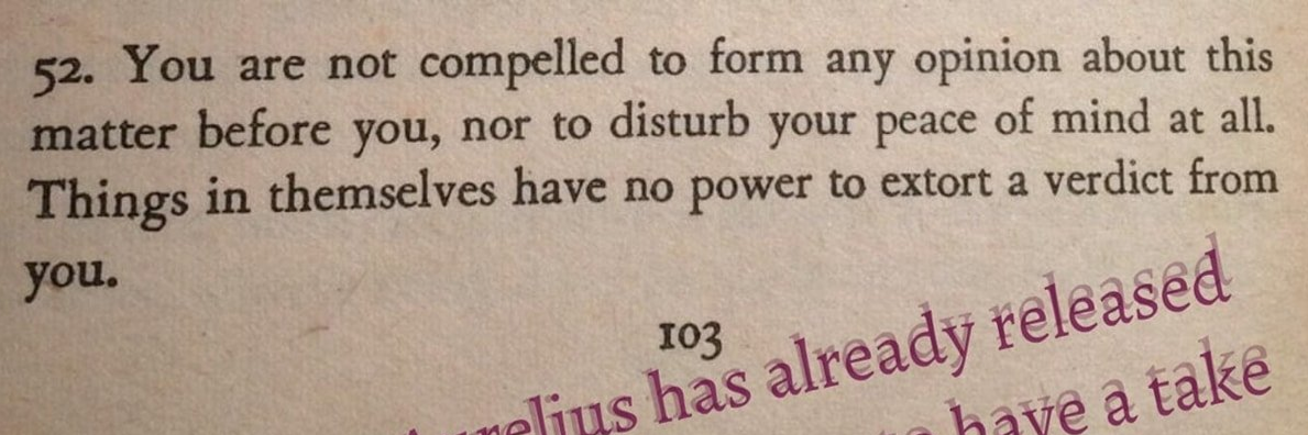 Banner: *You are not compelled to form any opinion about this matter before you, nor to disturb your peace of mind at all. Things in themselves have no power to extort a verdict from you.*
